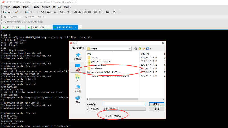 然后我们可以 输入命令 rz -y ,(rz 代表上传, -y 可以强制覆盖文件),会弹出一个文件选择框,我们可以鼠标选择jar包位置,确定即可,下次再上传的时候会直接弹出jar包窗口,当然下次用的时候也可以用tab键光标跳转选择,这就完全不用鼠标了,注意下面发送文件到ASCII不要打钩![]()